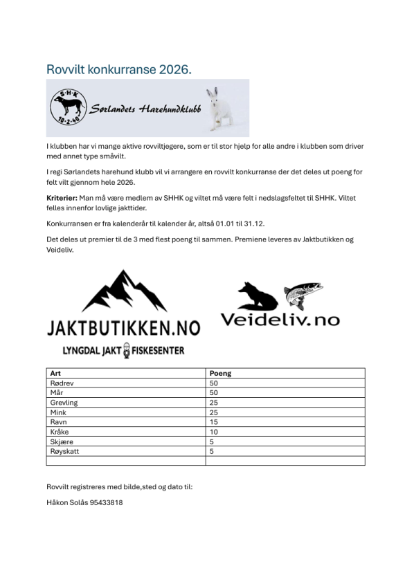 I regi av Sørlandets harehund klubb vil vi arrangere en rovilt konkurranse der det deles ut poeng for felt vilt gjennom hele 2026.